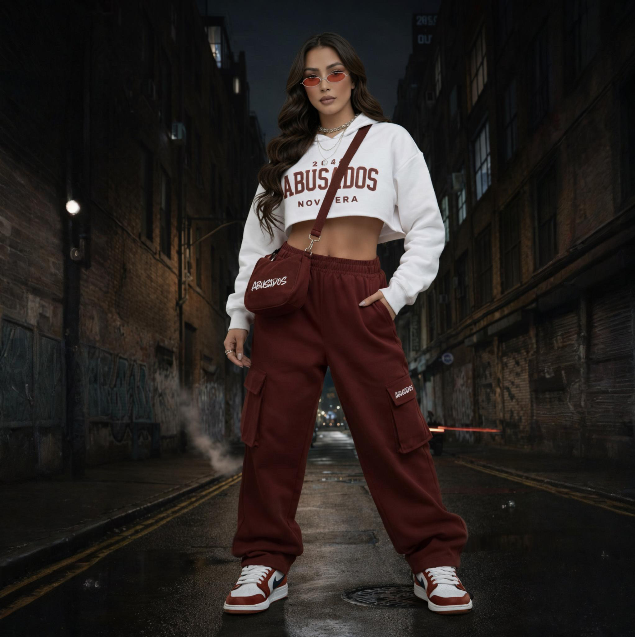 Conjunto streetwear feminino composto por cropped moletom branco “ABUSADOS – Nova Era”, calça cargo vinho de modelagem ampla e shoulder bag ABUSADOS, criando um visual urbano forte, moderno e equilibrado. As peças se complementam em conforto, atitude e identidade, entregando presença em qualquer cenário.